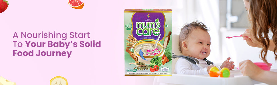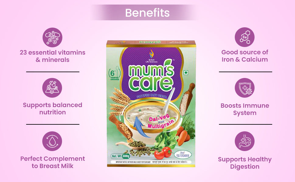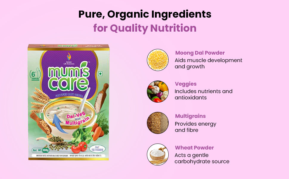 Mums Care Dal Veg Multigrain Baby Cereal is crafted with the perfect blend of wholesome grains, dal, and veggies to provide your baby with essential nutrients for healthy growth and development. Easy to digest and packed with natural goodness, this instant cereal is a trusted choice for moms who want to nourish their little ones with love. Enriched with vitamins, minerals, and dietary fibre, it supports your baby's digestion, immunity, and overall well-being.