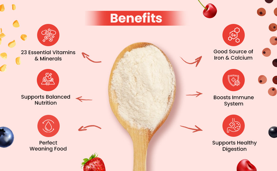 The Ragi & Moongdhal variant blends super grain ragi (finger millet), a natural source of calcium and amino acids, with protein-rich moongdhal. This combination helps strengthen bones and teeth, supports muscle growth, and helps maintain healthy weight gain. Iron from ragi and moong helps prevent anaemia and boosts red blood cell production, ensuring your baby stays active and energetic.