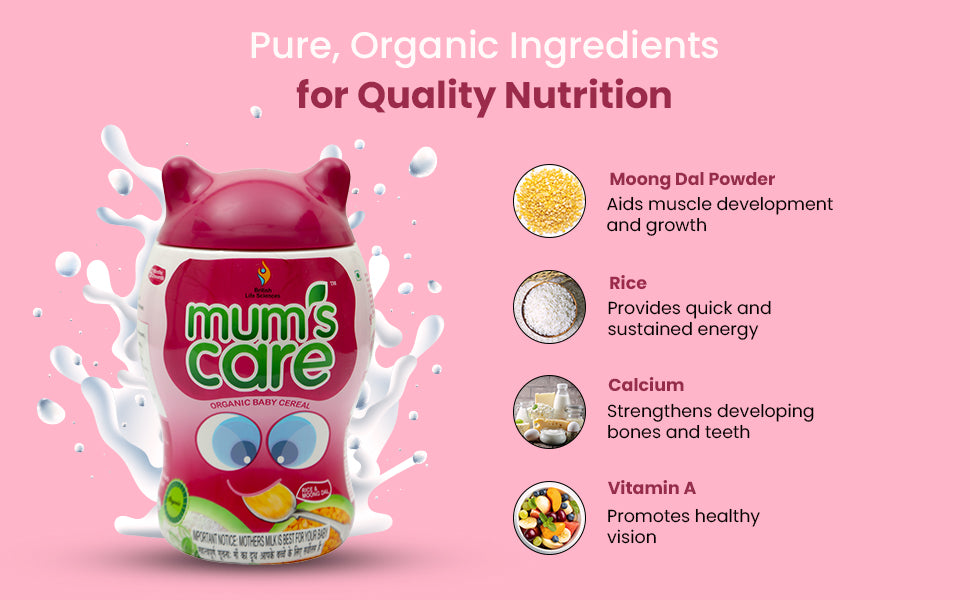 Support your baby’s growth journey with the balanced power of British Life Sciences Mum’s Care Cereal - Rice & Moongdhal | Mixed Fruit Combo Pack, thoughtfully created to combine gentle grains and tasty fruits, delivering essential daily nutrition for your little one.The Rice & Moongdhal variant blends easily digestible rice with protein-rich moongdhal to create a light, gentle cereal perfect for delicate tummies. It supplies natural plant proteins, carbohydrates, vitamins, and minerals that boost energy, build immunity, and aid healthy weight gain. Its mild taste and soft texture make it ideal as your baby's first solid food, easing them into nutritious eating habits.The Mixed Fruit variant pairs high-quality cereals with natural fruit extracts to deliver a sweet, delicious taste babies love. Rich in essential vitamins, minerals, and antioxidants, it supports brain development, strengthens immunity, and keeps your baby active and cheerful. The fruity flavour not only delights taste buds but also encourages a natural preference for wholesome foods.Both variants are specially formulated to be tummy-friendly, reducing chances of bloating or discomfort. Made without artificial colours, flavours, or harmful preservatives, they undergo strict international quality checks, giving you complete confidence every time you feed your child.This combo pack ensures you always have two nutritious options on hand — whether at home or while travelling. Simply mix with warm water or milk to prepare a smooth, creamy meal that’s both comforting and nourishing.Choose British Life Sciences Mum’s Care Cereal - Rice & Moongdhal | Mixed Fruit Combo Pack to give your baby a delightful balance of traditional gentle grains and fruity goodness, laying the foundation for a happy, healthy life.