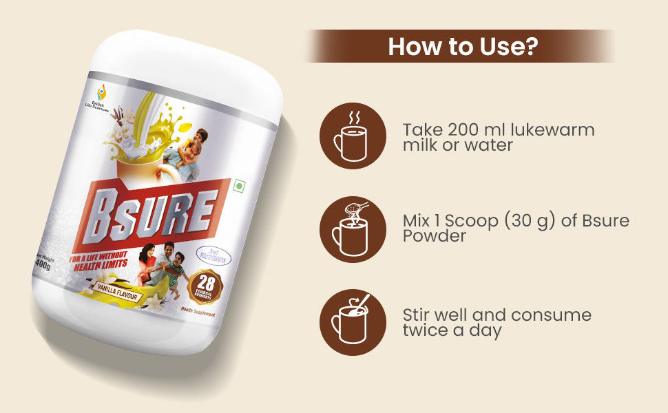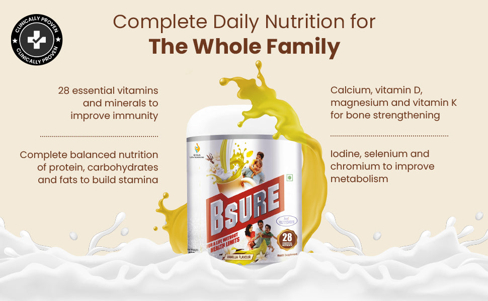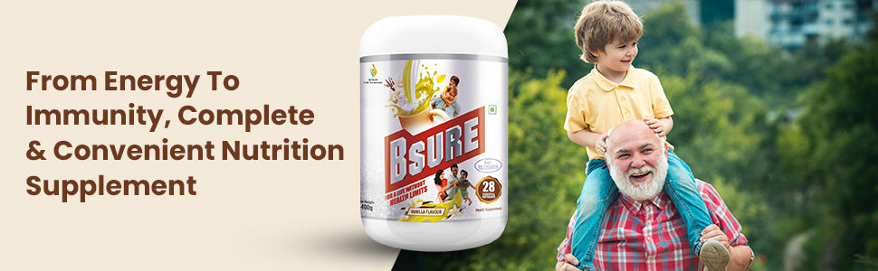 Packed with 28 essential nutrients, including vitamins, minerals, proteins, and antioxidants, this all-in-one vanilla-flavoured health drink provides your body with comprehensive nourishment. Whether you’re a working professional, a student, a homemaker, or a senior, Bsure supports energy production, immune defense, muscle strength, and bone health all in one delicious scoop.