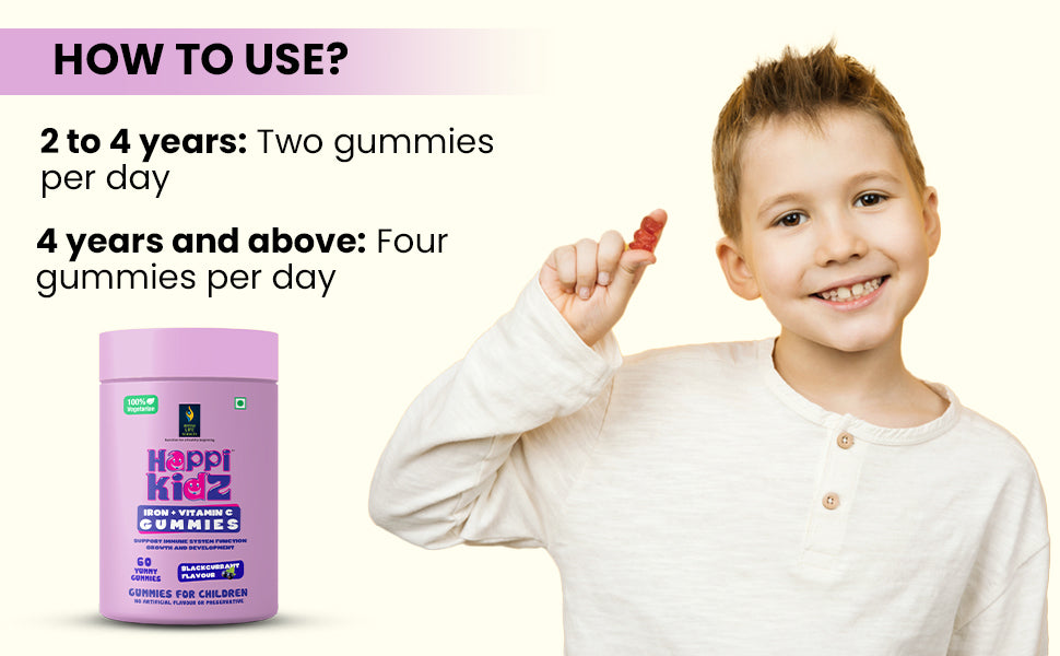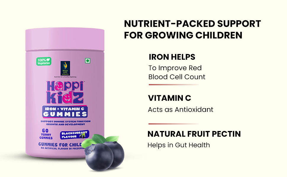 "Support your child's energy and immunity the fun and tasty way with Happi Kidz Iron + Vitamin C Gummies. Specially formulated for growing kids, these delicious strawberry-flavored gummies are packed with Iron and Vitamin C — two essential nutrients that work hand-in-hand to support overall health and development.