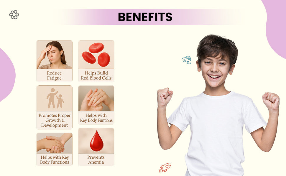 BOOSTS HEMOGLOBIN LEVELS: Enriched with elemental iron to support healthy red blood cell production and oxygen transport, helping prevent fatigue and iron deficiency in growing kids.